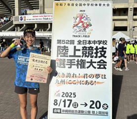是枝愛香さん(内部中3年生)が、九州・沖縄で開催された令和7年度全国中学校体育大会〔第52回全日本中学校陸上競技選手権大会〕女子1,500m競技で4分29秒39をマークし優勝という三重県勢初の快挙を成し遂げました。