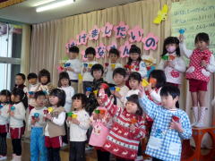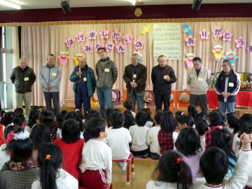 ![]() 内部幼稚園では2月19日(火)、ありがとう集会を開いて、いつもお世話になっている「内部っ子はげまし隊」のおじさんたちを招いて感謝の気持ちを伝えました。 お雛さまが飾ってあるホールで園児たちの歌、ダンス、ハンドベル、ピア二カの演奏と先生の踊りの演技を観賞した後、教室では子ども達と一緒に給食をいただきました。 はげまし隊のおじさんたちは孫のようなかわいい園児に囲まれて「安らかな気持ちになった、癒された、元気をもらった」と緩みっぱなしの笑顔で楽しく過ごしました。園児、職員、保護者の方皆さんのもてなしの気持ちが伝わり、楽しい時間をありがとうございました。 ![]() 内部っ子はげまし隊は平成24年度内部幼稚園へは、ジャガイモの植付け・収穫、キウイの剪定・受粉、サツマイモの植付け・収穫、玉ねぎ植え・収穫、焼き芋大会、草取り・腐葉土の片づけ、遊具のペンキ塗りなどこの1年間で14回、延べ67名が行事支援と施設補修を行いました。 (2013年2月19日 内部っ子はげまし隊より情報提供がありました)