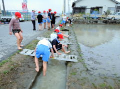 田植えが済んだあとは、そばを流れる用水路で手と足を洗います