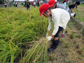 坂さんはみんなに、苗代からはじまって稲が育ち、穂ができて籾(モミ)となり、脱穀・籾すり・乾燥した後、精米して白米となるまで、コメつくりには多くの時間と手間がかかっていることを説明。その後生徒たちは稲刈りと脱穀に取り組みました。