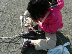 材料集めの後はコミュニティセンターへ戻っていよいよリース作り。つる(蔓)の種類と太さ、リースの大きさに合わせて輪を作る時のつるの巻き方、力の入れ方がポイントで、子供たちは苦労しながらいろいろなサイズの輪を作りました。このつるの輪に、カラスウリ・ヒノキ・ヒイラギ・ナンキンハゼ・チャ・クロガネモチ等中から好みの材料を選んで、ホットメルトガンで接着したり、蔓の隙間に押し込んだりして飾り付けを行い、「クリスマスリース」を作り上げて行きました。