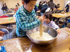 2月8日(日)社協青少年育成部が主催する五平餅づくりがありました。今年は雨のため欠席者が多く参加者は約30名。例年、五平餅と豚汁の準備をしている間に内部川の土手で凧あげをして、お腹をすかせてからおいしく頂くことにしていますが、今年はいきなり五平餅に取り掛かりました。