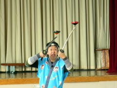 子ども達は食い入るように見つめています。 | 珍しいアメリカ製ミッキーマウスのけん玉。 巧みな話術で子供たちをひきつけます。 |