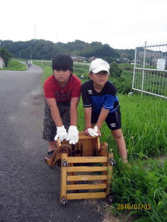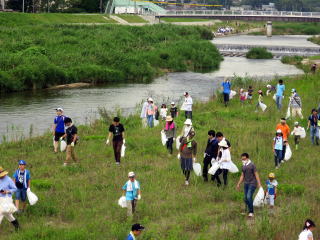 この後、参加者は8つのグループに分かれて、内部川(北小松前川橋から小古曽新田橋まで)と足見川(宮橋まで)の堤防周辺、及び采女地内の通学路を巡ってごみを拾い集めました。また今年で6年目となるアレチウリ駆除についても繁殖地3カ所を中心に240人が取り組みました。