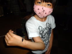 ホタル教室では、一人一匹のホタルを貰ってホタル観察を行いました。参加者等は、暗幕の引かれた教室をホタルがひかり輝いて飛ぶと校舎内に歓喜を響かせて追いかけました。